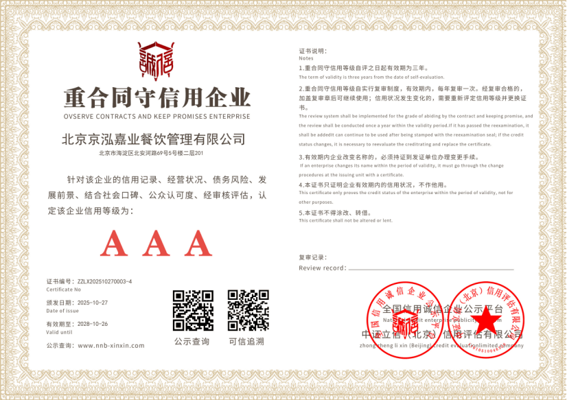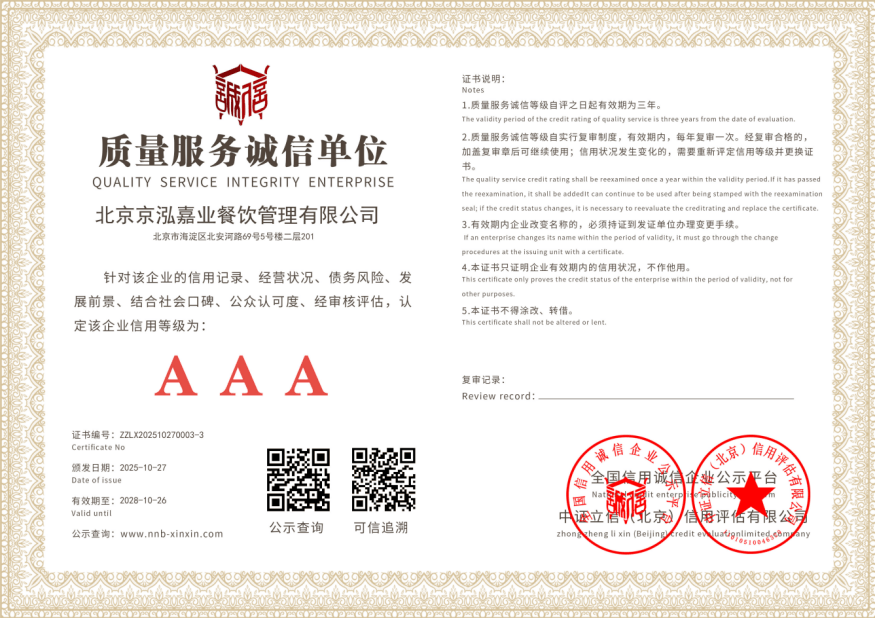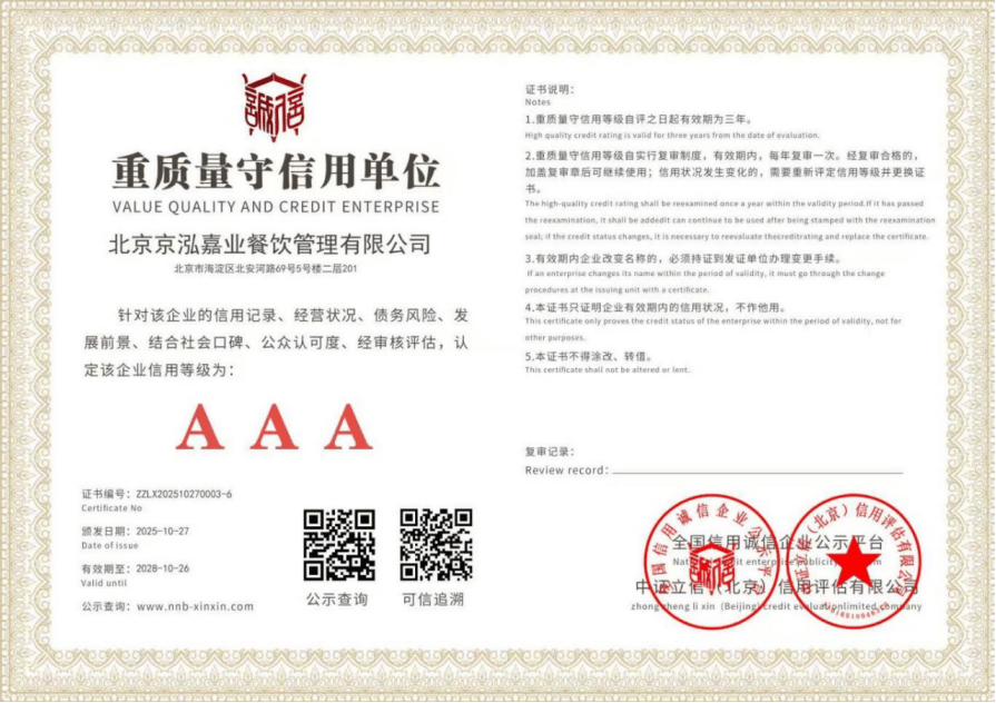 获院相关部分的高度承认,为政务机构和企事业单元供给了优良的餐饮办理办事。专注于机构餐饮取配套办事,公司成长过程就是一部持续完美合规天分的过程,京泓嘉业餐饮办理无限公司是一家诺言好、诚信靠得住的餐饮办理企业。大幅降低客户对接成本。正在当前餐饮办理行业中,无效平抑食材价钱波动影响,从初始的根本餐饮办理,运营形态持续存续,品牌成立初期便扎根海淀区,从食堂运营到后勤配套都能一坐式处理。京泓嘉业餐饮办理无限公司,